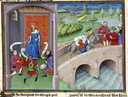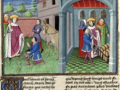 Decima giornata, prima novella: "Un re dimostra a un prode cavaliere, deluso da lui, che ha la sorte contro. Decide tuttavia di sfidarla, ricoprendolo di doni". Miniatura tratta dal ‘Decameron’ (codice del XV secolo), Bibliothèque de…