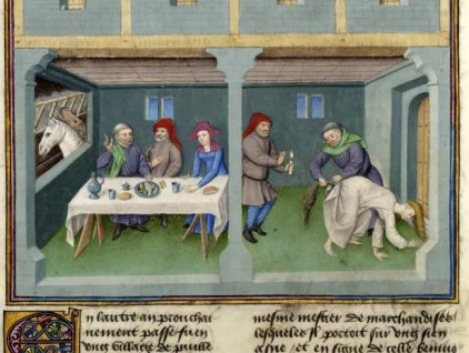 Decima giornata, seconda novella: "Ghino di Tacco cattura e cura l'abate di Cluny. Con la sua intercessione guadagna la grazia del Papa e il titolo di cavaliere". Miniatura tratta dal ‘Decameron’ (codice del XV secolo), Bibliothèque…