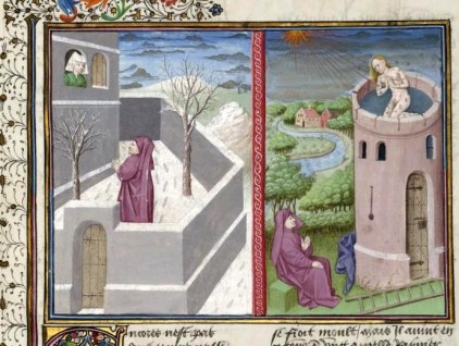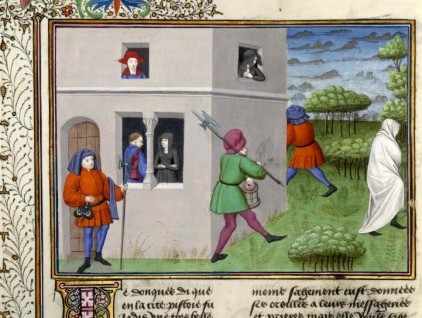 Nona giornata, prima novella: "Una vedova, che non ricambia i sentimenti di due corteggiatori, se ne serve per sbarazzarsi di entrambi con un doppio tranello". Miniatura tratta dal ‘Decameron’ (codice del XV secolo), Bibliothèque de l’Arsenal, Parigi.