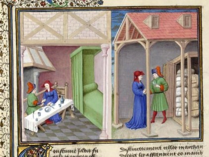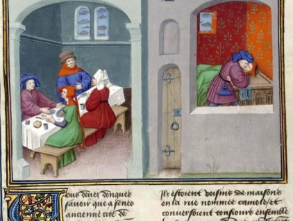 Ottava giornata, decima novella: "Dalla giovane donna beffato, perde tutto e riparte scornato. Tornerà ben deciso a rifarsi: riuscirà con maestria a vendicarsi". Miniatura tratta dal ‘Decameron’ (codice del XV secolo), Bibliothèque de l’Arsenal, Parigi.