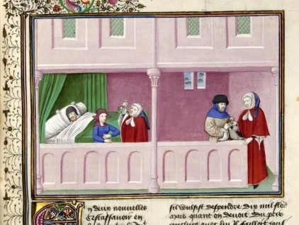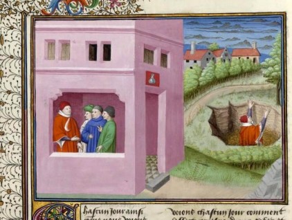 Ottava giornata, nona novella: "Un medico credulone, ruffiano e superbo, tenta di entrare in una fantomatica lieta brigata ma finisce scaricato in un letamaio". Miniatura tratta dal ‘Decameron’ (codice del XV secolo), Bibliothèque de l’Arsenal, Parigi.