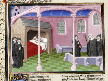 Nona giornata, seconda novella: "Una badessa vuole punir due peccatori colti in flagrante. Ma sul suo capo, strano da dir, spuntan le brache del proprio amante". Miniatura tratta dal ‘Decameron’ (codice del XV secolo), Bibliothèque de l’Arsenal,…