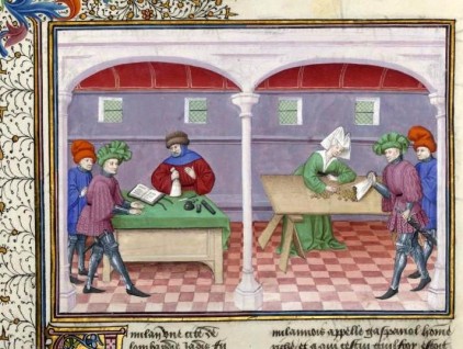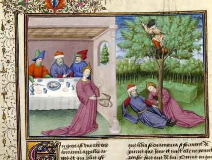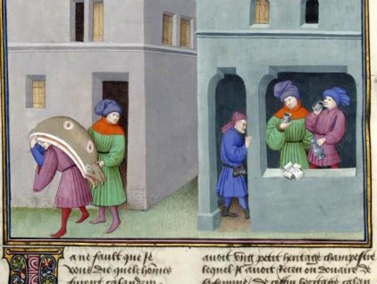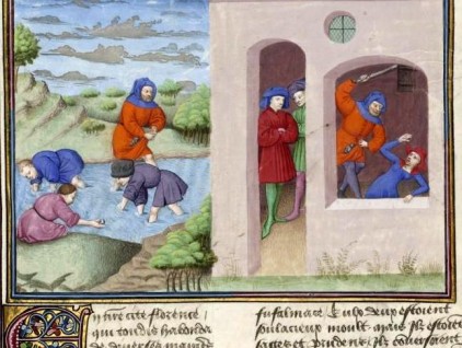 Ottava giornata, terza novella: "Un grullo, persuaso da amici d'aver trovato la pietra dell'invisibilità, batte la moglie, rea d'averlo riportato alla sventura". Miniatura tratta dal ‘Decameron’ (codice del XV secolo), Bibliothèque de l’Arsenal, Parigi. Leggi…