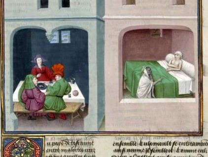 Settima giornata, nona novella: "Pirro ottiene da Lidia tre prove d'amore. Si sollazzano perfino sotto gli occhi del marito, e gli fanno credere che non è vero". Miniatura tratta dal ‘Decameron’ (codice del XV secolo), Bibliothèque…