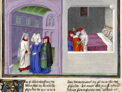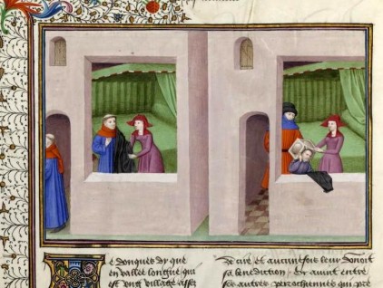 Ottava giornata, seconda novella: "Per concedersi chiede monete, ed in pegno il manto del prete. Dovrà renderlo assai contrariata, perché il prete l'ha raggirata". Miniatura tratta dal ‘Decameron’ (codice del XV secolo), Bibliothèque de l’Arsenal, Parigi.…