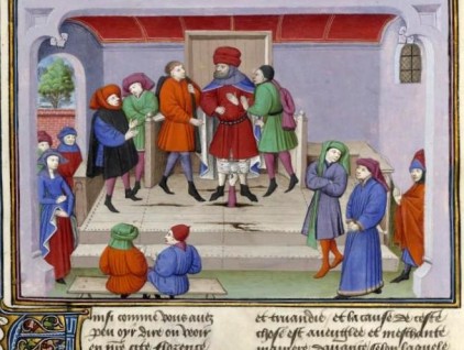 Ottava giornata, quinta novella: "In tre puntan un giudice sciatto (non è certo vestito di gala). Due compari lo tengon distratto ed il terzo le brache gli cala". Miniatura tratta dal ‘Decameron’ (codice del XV secolo),…