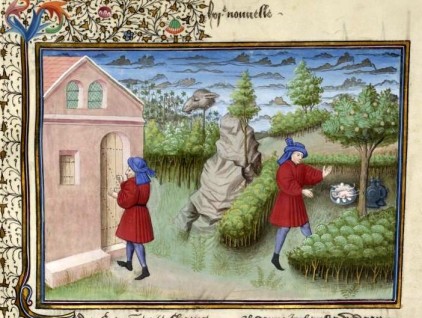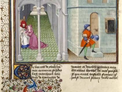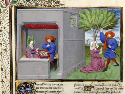 Settima giornata, settima novella: "Due piccioni con una fava. Manda il marito in giardino travestito da lei e gli dimostra la sua fedeltà e la lealtà dell'amante". Miniatura tratta dal ‘Decameron’ (codice del XV secolo), Bibliothèque…