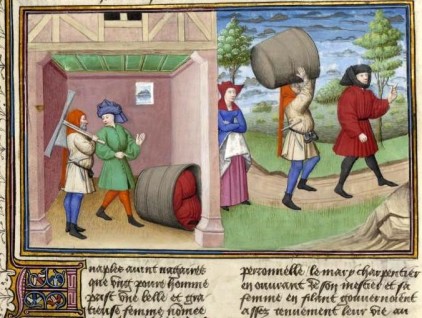 Settima giornata, seconda novella: "Lo convince che l'amante, ch'era nascosto in un tino, lo sta esaminando per comprarlo. Il marito lo pulisce, loro si divertono". Miniatura tratta dal ‘Decameron’ (codice del XV secolo), Bibliothèque de l’Arsenal,…