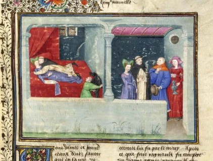 Settima giornata, terza novella: "Mentre Agnese si sollazza con Rinaldo rientra il marito. La donna gli fa credere che il compare è lì per guarire il figlioccio". Miniatura tratta dal ‘Decameron’ (codice del XV secolo), Bibliothèque…