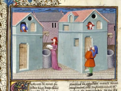 Settima giornata, quarta novella: "Tofano beve, Ghita lo tradisce. Lui se ne accorge e la chiude fuori. Lei l'attira all'esterno, si barrica in casa, lo vitupera". Miniatura tratta dal ‘Decameron’ (codice del XV secolo), Bibliothèque de…