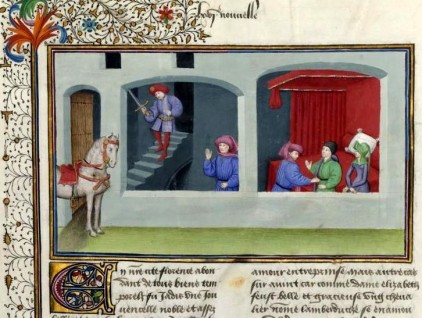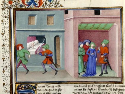 Settima giornata, sesta novella: "Isabella, sorpresa dall'uno, occulta l'altro. Ma torna il marito, e architetta allora un piano per nascondere la doppia tresca". Miniatura tratta dal ‘Decameron’ (codice del XV secolo), Bibliothèque de l’Arsenal, Parigi. Leggi…