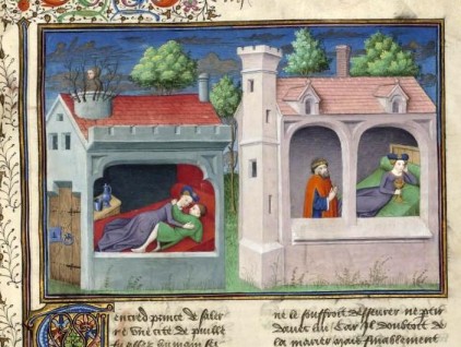 Quarta giornata, sesta novella: "Andreuola ama Gabriotto. I due sognano presagi funesti. Lei, dopo la morte di lui, è tentata invano dal podestà e si fa monaca". Miniatura tratta dal ‘Decameron’ (codice del XV secolo), Bibliothèque…