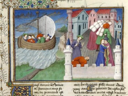 Quarta giornata, terza novella: "Tre coppie viaggiano verso Creta. Incolpati della morte degli altri, ma innocenti, i due sopravvissuti moriranno poveri a Rodi". Miniatura tratta dal ‘Decameron’ (codice del XV secolo), Bibliothèque de l’Arsenal, Parigi. Leggi…