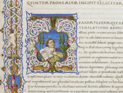 Iniziale "T" (Tuarum plerumque rerum) raffigurante Strabone che presenta la sua opera, miniatura tratta dal codice 'Geographica' di Ferdinando d'Aragona (Firenze, seconda metà del XV secolo), Bibliothèque nationale de France, Parigi.