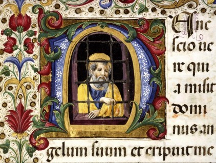 Iniziale raffigurante "san Pietro in carcere", tratta dal Messale di Thomas James (Firenze, 1483), Bibliothèque municipale, Lione.