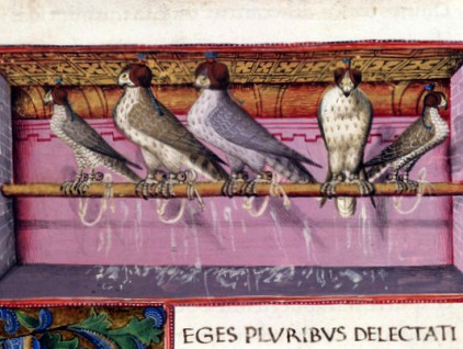 Iniziale "R", da Trattato di falconeria (metà XV secolo), Beinecke Rare Book Library, Yale University.