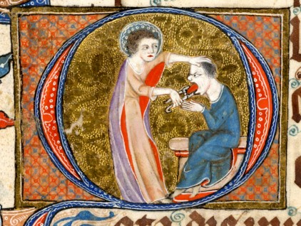 Iniziale "Q" (Quid gloriaris in Maria) raffigurante "Santo che estrae la lingua di un uomo seduto con le tenaglie", tratta dal 'Luttrell Psalter' (Inghilterra, 1325-1340), British Library, Londra.