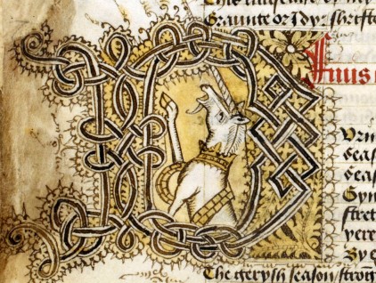 Iniziale "D" (Duringe) raffigurante un unicorno, tratta dal Testamento di John Lydgate (Inghilterra, 1457-1530 circa), British Library, Londra.