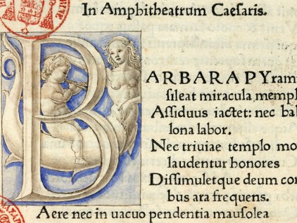 Iniziale "B" (Barbara pyramidum sileat), illustrazione tratta da 'Epigrammata' (1472 circa), Bibliothèque Mazarine, Parigi.