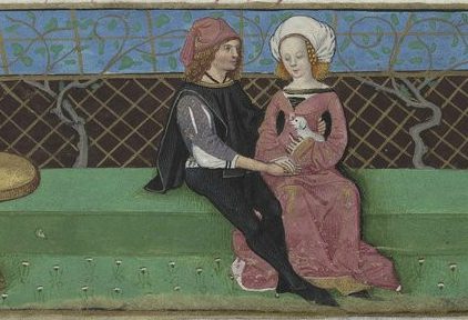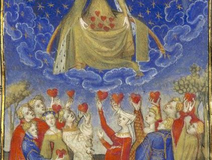 Dettaglio della miniatura tratta dal manoscritto "L' Epistola di Othéa", in cui uomini e donne porgono i propri cuori a Venere, dea dell’amore”, Harley MS 4431, c. 100r, XV secolo, British Library, Londra. Detail of a…