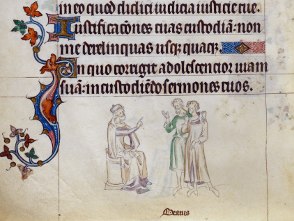 Detail of a bas-de-page scene of an assisted Valentine before a judge, with a zoomorphic initial 'I'(n) containing a dragon. Saint Valentine's Day is a religious holiday nowadays celebrated in many countries in the world; it's…