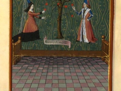 "La Speranza e la Folle Presunzione, dopo aver spalmato la colla sull'albero, recuperano i cuori volubili catturati", miniatura tratta dal ‘Livre du Coeur d’amour épris’ (XV secolo), Bibliothèque nationale de France, Parigi.