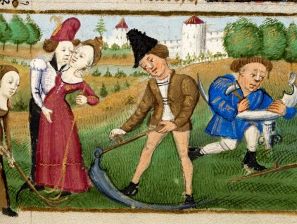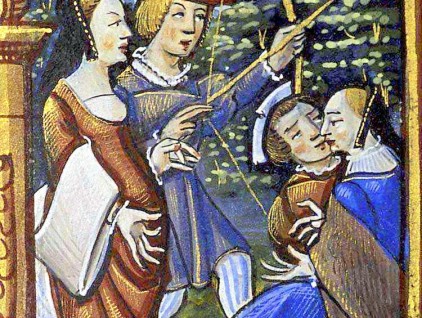 "Coppia a caccia e coppia di amanti", miniatura tratta dal Libro d’Ore MS. Auct. D. inf. 2. 11 (1440-1450), Bodleian Library, Oxford.