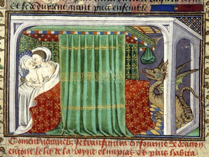 "Nectanebo e Olimpia, con il drago-serpente ai piedi del letto", miniatura tratta dal 'Talbot Shrewsbury book' (1444-1445), British Library, Londra.