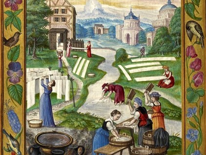 "Donne lavano i panni nel fiume e li stendono ad asciugare", miniatura tratta dal codice 'Splendor Solis" (Germania, 1582), British Library, Londra.