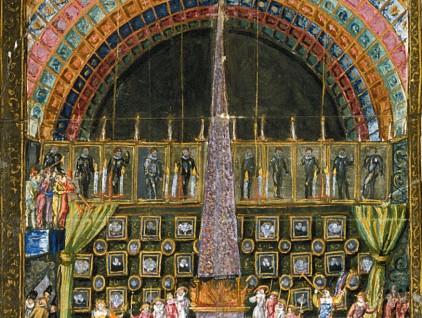 "La prima di uno spettacolo al teatro di Montbrison", miniatura su carta del 1588, British Library, Londra.