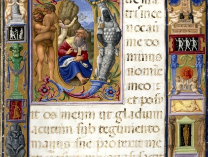 Pagina miniata da Giulio Clovio con iniziale raffigurante san Zaccaria e bordi con soggetti egizianeggianti, 'Messale di Pompeo Colonna' (Italia, 1555), The University of Manchester Library.