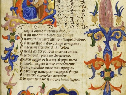 Pagina miniata tratta dal 'Canzioniere', con la poesia "Voi ch'ascoltate in rime sparse il suono" (Firenze, XIV secolo), The University of Manchester Library. Nel bordo inferiore compare lo stemma della famiglia Strozzi.