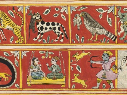 "Le forme della violenza", illustrazione tratta dal 'Sangrahanisutra' (India, 1663-1664), Philadelphia Museum of Art. La scena raffigurante la coppia seduta allude alla componente violenta dell'atto amoroso.