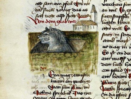 Illustrazione tratta dall'opera 'Buch der natur' di Conrad de Megenberg (Germania, 1434), Bibliothèque nationale de France, Parigi. Nel medioevo si credeva che le iene ci cibassero dei cadaveri umani mangiandoli direttamente nella tomba (da cui…