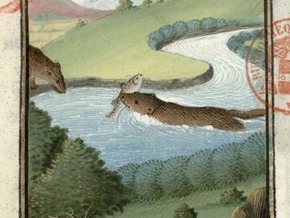 "Lontre", miniatura tratta dal 'Livre de la chasse de Gaston Phébus' (precedente al 1476), Bibliothèque Mazarine, Parigi.