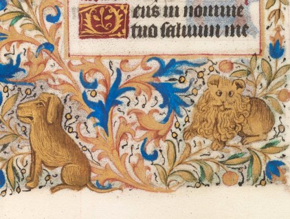 "Cane e leone", miniatura tratta da Libro d’Ore all’uso di Roma (1450-60), Collezione privata, Svizzera.
