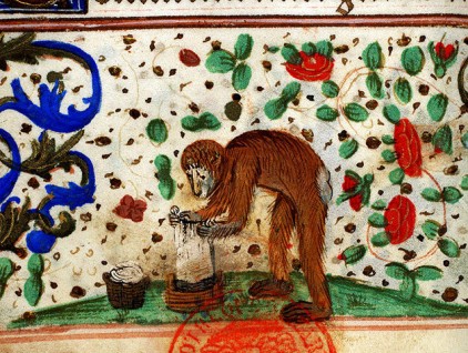 "Scimmia che fa il bucato", miniatura tratta da Libro d'Ore all'uso di Roma (fine XV secolo), Bibliothèque Mazarine, Parigi.