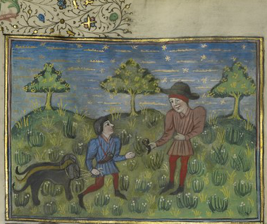 UN DOTTORE, UN CACCIATORE E TRE CANI MALATI, 1430 - 1440. Unknown, illuminator, A Doctor, a Hunter, and Three Sick Dogs, French, about 1430 - 1440, Tempera colors, gold paint, silver paint, and gold leaf…