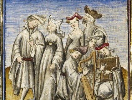"Déduit a braccetto con la Felicità", miniatura tratta dal 'Roman de la Rose' (Parigi, 1405), Getty Museum, Los Angeles.