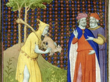 "Giullare che finge di suonare uno strumento usando un piccolo animale", miniatura tratta da 'Bibbia istoriata' (inizi XV secolo), British Library, Londra.