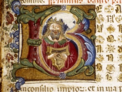 Iniziale "B" (Beatus) raffigurante "Re Davide che suona l'arpa", miniatura tratta dal codice MS. Canon. Liturg. 20 (fine XV secolo), Bodleian Library, Oxford.