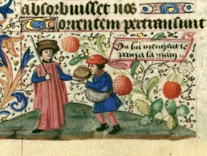 "Il lui mange le pain dans la main" Miniatura tratta dal 'Libro d'Ore con proverbi' - codice NAL 3134 (metà XV secolo), Bibliothèque nationale de France, Parigi.