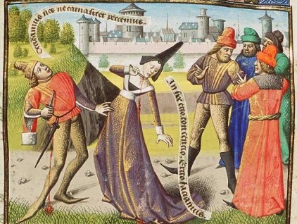 "Per evitare l'adulterio una coppia di amanti si uccide, incorrendo in un peccato peggiore" Miniatura tratta da La Cité de Dieu Codice 10 A 11 (1475 e 1478-1480) Koninklijke Bibliotheek, L'Aia