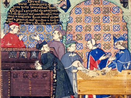 "L'avarizia. Scena ambientata nel Banco di San Giorgio di Genova", miniatura tratta dal 'Trattato sui sette vizi' (1330-1340 circa), British Library, Londra.