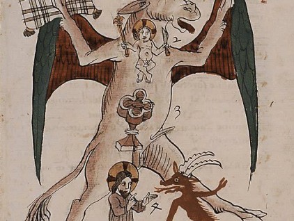 "I simboli di san Luca", miniatura tratta dal codice 'Ars memorandi capitula evangeliorum' (1475-1500), Koninklijke Bibliotheek, L'Aia.