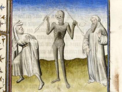"La morte minaccia sia i giovani che gli anziani", miniatura tratta dal 'Livre de vieillesse' (traduzione in francese del 'De Senectute' di Cicerone, 1405-1410), Bibliothèque nationale de France, Parigi.