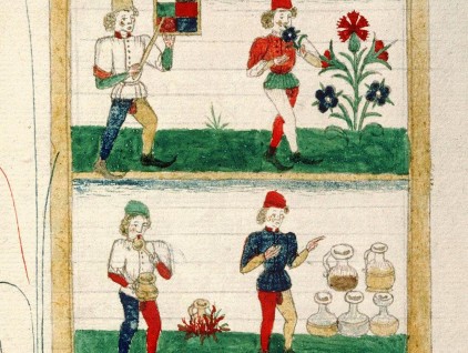 "Colore, odore, sapore e liquore", miniatura tratta dal 'Livre des propriétés des choses' (1480-1490), Bibliothèque municipale, Tours.
