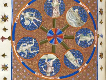 "Diagramma circolare dei pianeti", miniatura tratta dal 'Breviari d'Amor' (fine del XIV secolo), British Library, Londra. Ogni pianeta - cui è associato un giorno della settimana diverso - è rappresentato come una figura umana: il Sole…