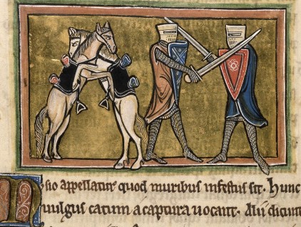 "Combattimento tra due cavalieri e i due rispettivi cavalli", miniatura tratta da Bestiario (secondo quarto del XIII secolo), British Library, Londra.
