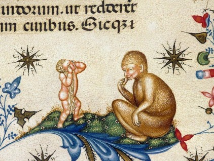 "L'uomo-scimmia ruba il cibo a un fanciullo, che scoppia in lacrime", miniatura tratta dal 'Breviario di Maria di Savoia' (1430 circa), Bibliothèque municipale, Chambéry.